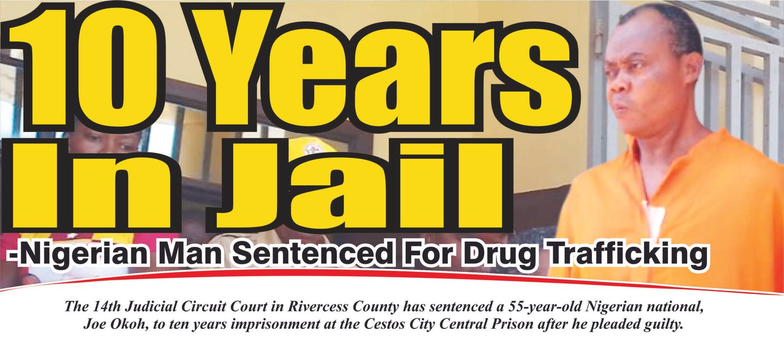 The 14th Judicial Circuit Court in Rivercess County has sentenced a 55-year-old Nigerian national, Joe Okoh, to ten years imprisonment at the Cestos City Central Prison after he pleaded guilty.