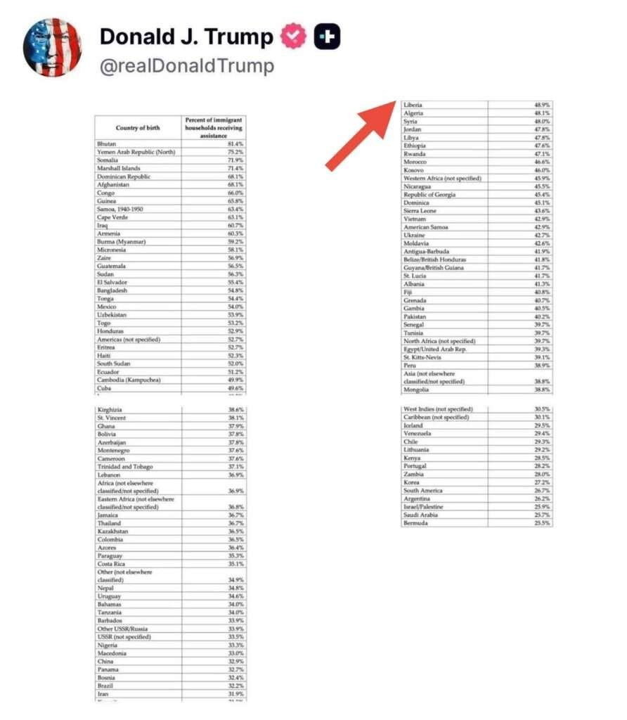 A statistical chart circulated by President Donald J. Trump on social media this week has drawn particular attention to Liberia, ranking it among the countries with the highest percentage of immigrant households in the United States receiving public assistance.