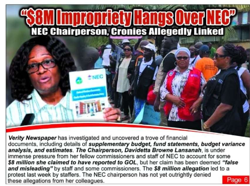 The Chairperson, Davidetta Browne Lansanah, is under immense pressure from her fellow commissioners and NEC staff to account for some US$8 million she claimed to have reported to GOL. However, staff and some commissioners have deemed her claim “false and misleading.” The $8 million allegation led to a protest last week by staffers. The NEC chairperson has not yet outrightly denied these allegations from her colleagues.