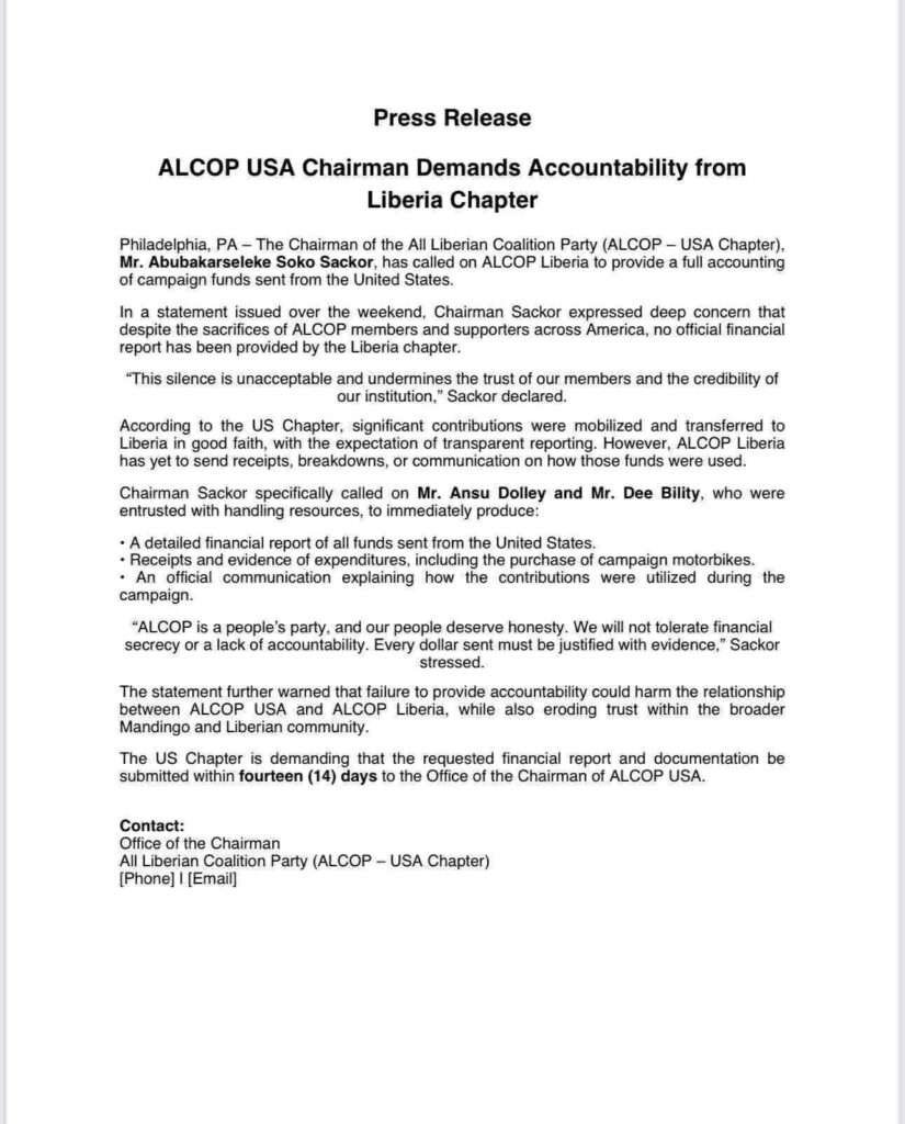 Philadelphia, USA — The Chairman of the All Liberian Coalition Party (ALCOP) USA Chapter, Mr. Abubakarseleke Soko Sackor, has called ALCOP Liberia to provide a comprehensive accounting of campaign funds sent from the United States. In a statement released over the weekend, Sackor expressed deep concern over the lack of official financial reporting from the Liberia chapter, despite the significant sacrifices made by ALCOP members and supporters across America.