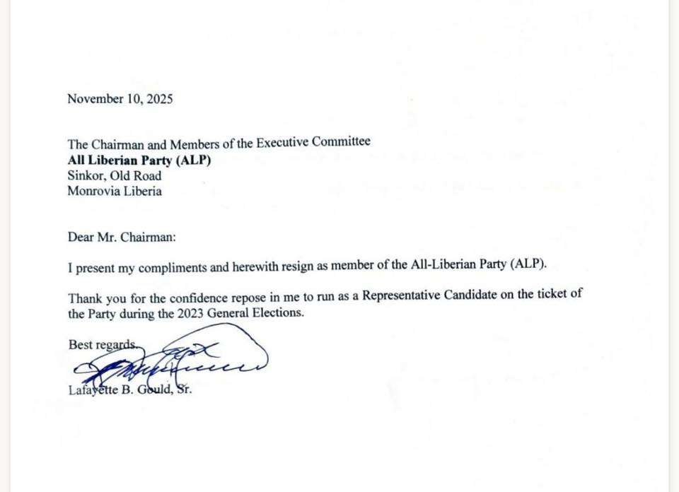 Monrovia – Prominent All Liberian Party member and former Montserrado County District #12 representative candidate, Cllr. Lafayette B. Gould Sr., has tendered his resignation from the party, sparking widespread public concern and speculation over his decision.