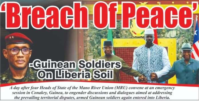A day after four Heads of State of the Mano River Union (MRU) convene at an emergency session in Conakry, Guinea, to engender discussions and dialogues aimed at addressing the prevailing territorial disputes, armed Guinean soldiers again entered into Liberia.