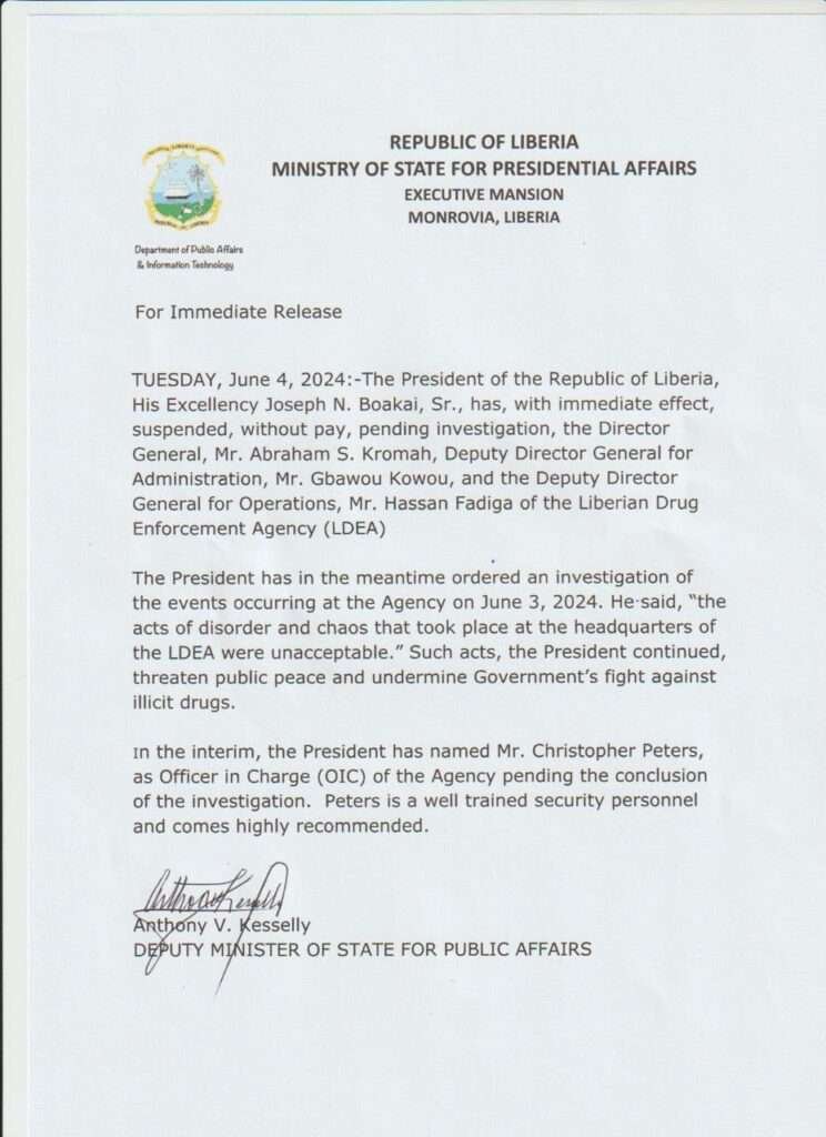 The suspension follows a tumultuous incident at the LDEA headquarters on June 3, 2024, which President Boakai described as “acts of disorder and chaos.” Such behavior, he emphasized, is not only unacceptable but also poses a significant threat to public peace and undermines the government’s robust efforts to combat illicit drug activities.