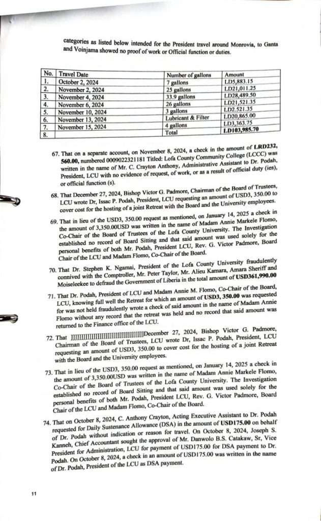 Additionally, evidence shows payments made to employees based in Monrovia, including Vamuyah Kanneh, listed as Dr. Podah’s secretary, despite having no attendance or presence on campus.