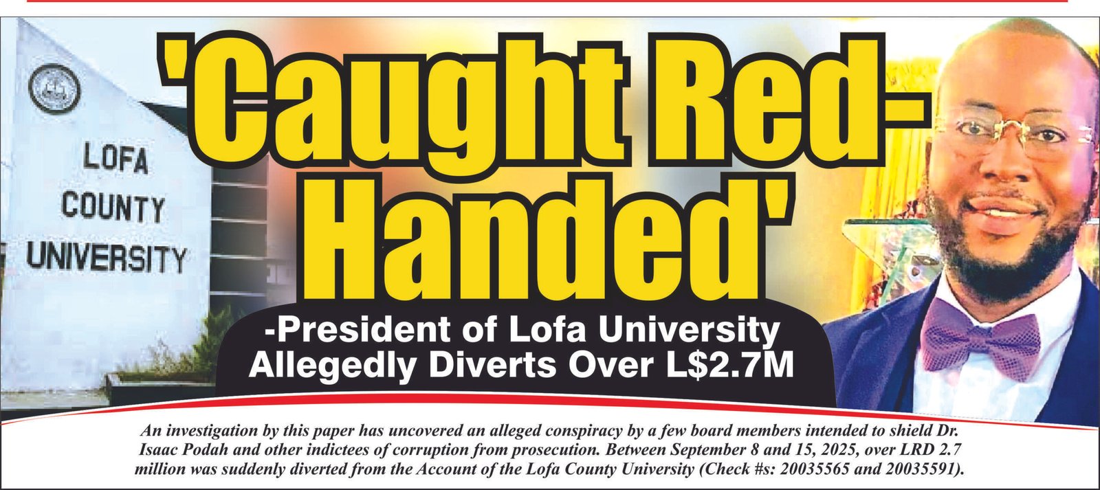 Between September 8 and 15, 2025, over LRD 2.7 million was suddenly diverted from the account of Lofa County University (Check #s: 20035565 and 20035591) by Dr. Isaac P. Podah, President of Lofa County University, in collaboration with key board members.