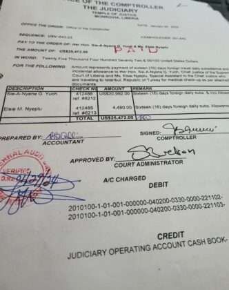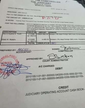 The investigation of Verity has revealed that Chief Justice Yuoh and her Special Assistant, Elsie M. Nyeplu, were paid a total of US$25,472 as foreign travel daily subsistence and incidental allowance to facilitate a 16-day foreign medical check-up in Turkey for Her Honor Chief Justice Sie-A-Nyene G. Yuoh. The office of the Comptroller of the Judiciary disbursed US$20,992 to Chief Justice Yuoh (Check #412488) and US$4,480 to Special Assistant Elsie Nyeplu (Check #412485).