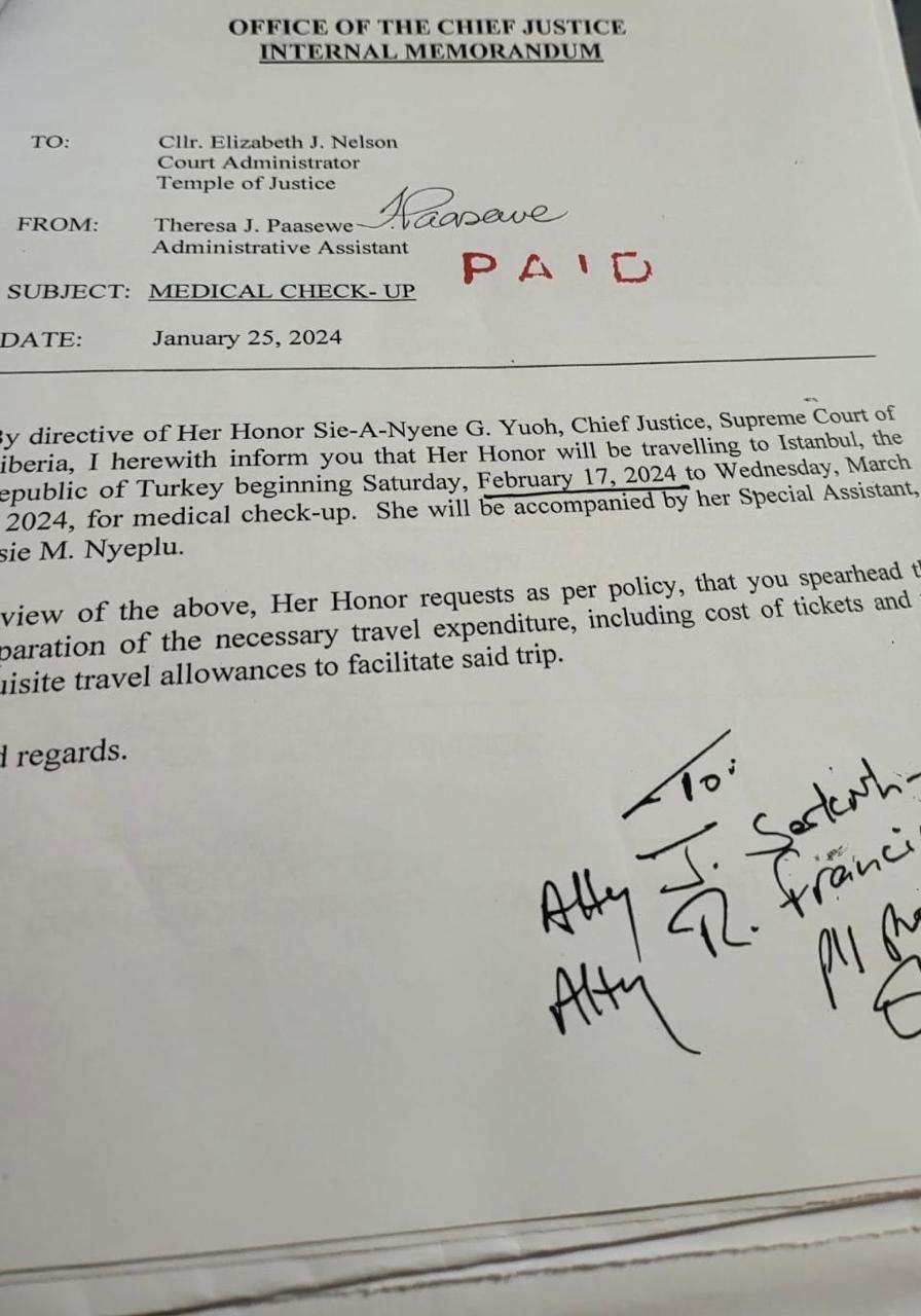 In continuation of this transgression, the investigation of Verity News has also uncovered that the Chief Justice, Her Honor Sie-A-Nyene G. Yuoh, who’s an arbiter/interpreter of the law, has also violated the law by spending more money on DSA and Incidental Allowance for a personal trip (medical check-up) in Turkey. But will there be any refund this time around?