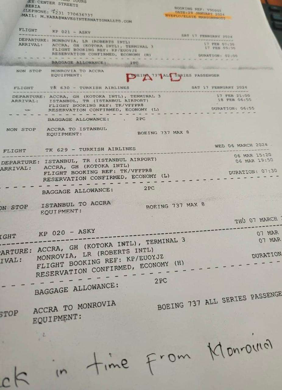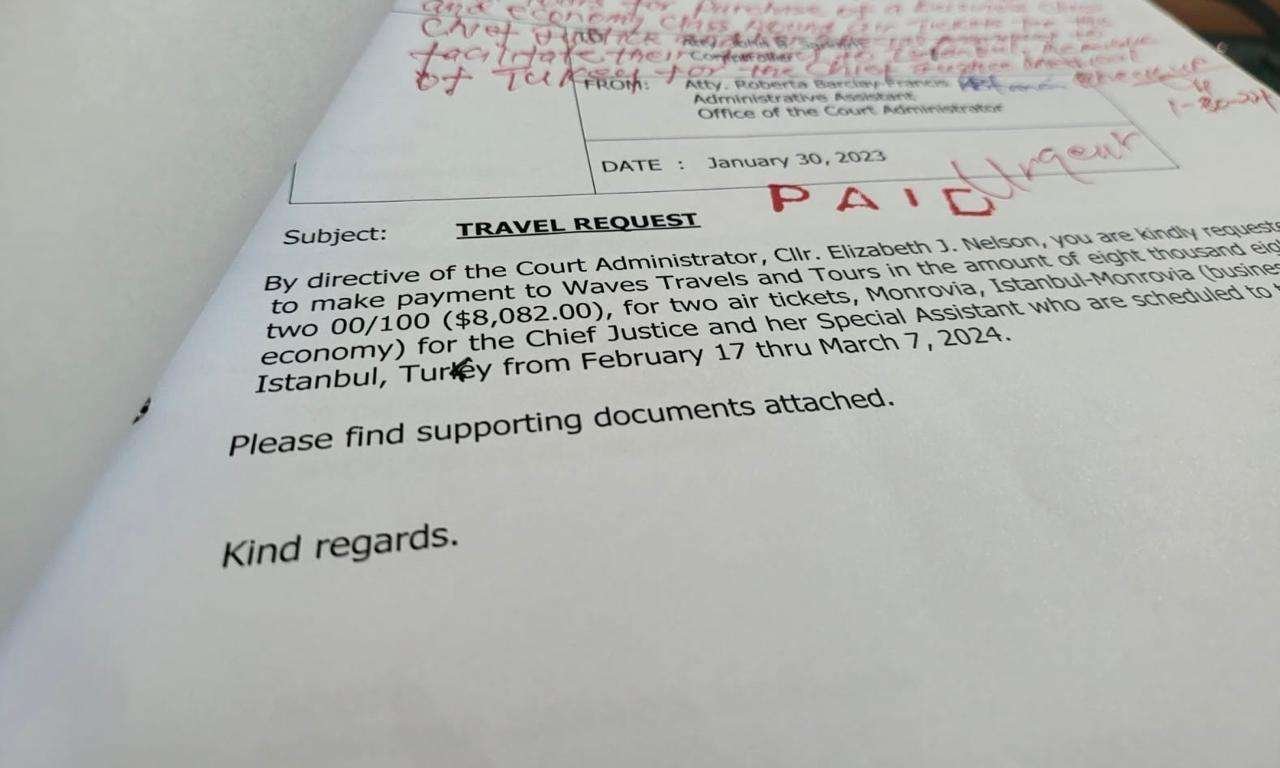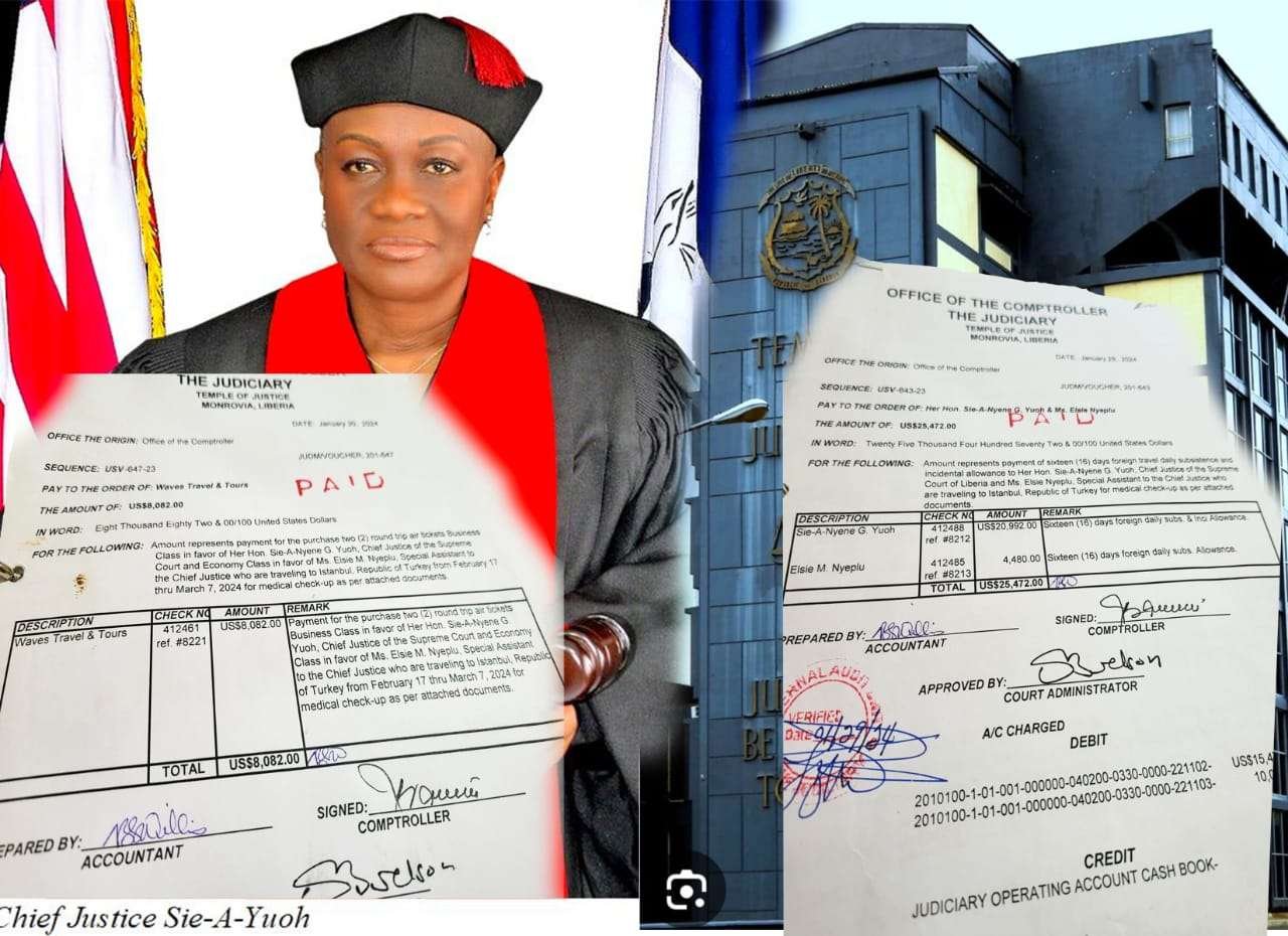With documentary evidence in our possession, we have investigated and uncovered how Chief Justice Sie-A-Nyene G. Yuoh spent US$25,472 on DSA alone and US$8,082 on Air Tickets to seek Medical check-ups in Turkey. Such a lavish expenditure on a single trip in a poor country like Liberia violates GOL Revised 2016/2017 Travel Ordinance Law.