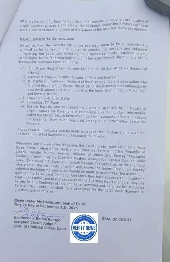The Civil Law Court of the Sixth Judicial Circuit, Montserrado County, presided over by Assigned Circuit Judge His Honour J. Boima Kontoe, has issued a contempt order for the arrest and detention of several high-profile former government officials and individuals over the controversial disappearance of a 53.34-carat diamond.
