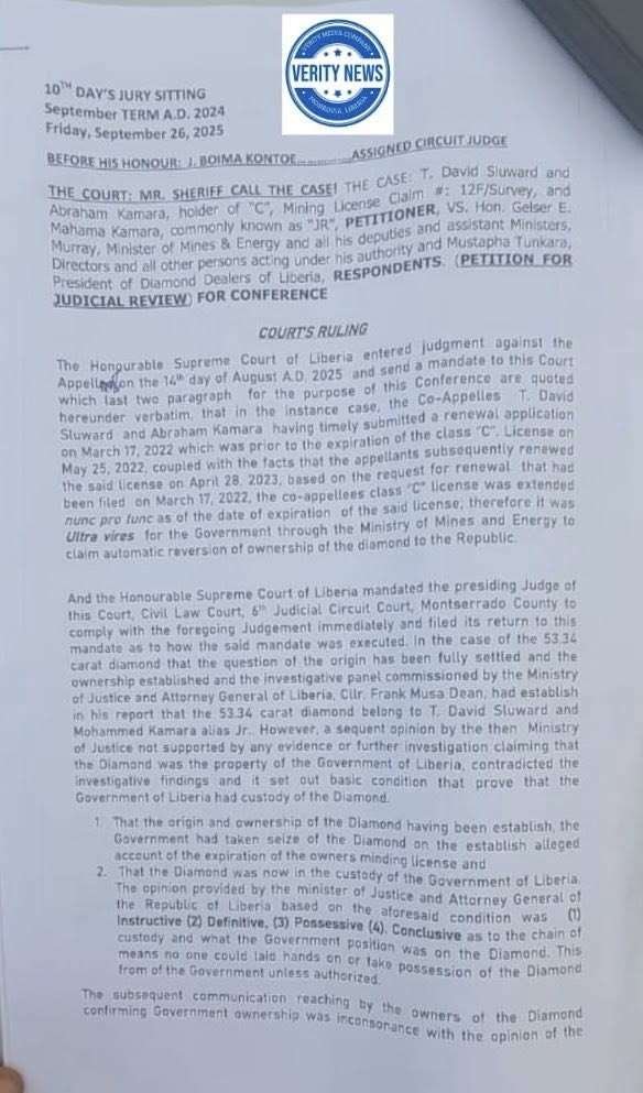 The ruling follows a mandate from the Supreme Court of Liberia dated August 14, 2025, which held that petitioners T. David Sluward and Mahama Kamara (alias “IR”) had legally renewed their Class “C” mining license. The Court ruled that the Ministry of Mines and Energy acted ultra vires—beyond the scope of its legal authority—when it claimed the diamond as property of the Republic.