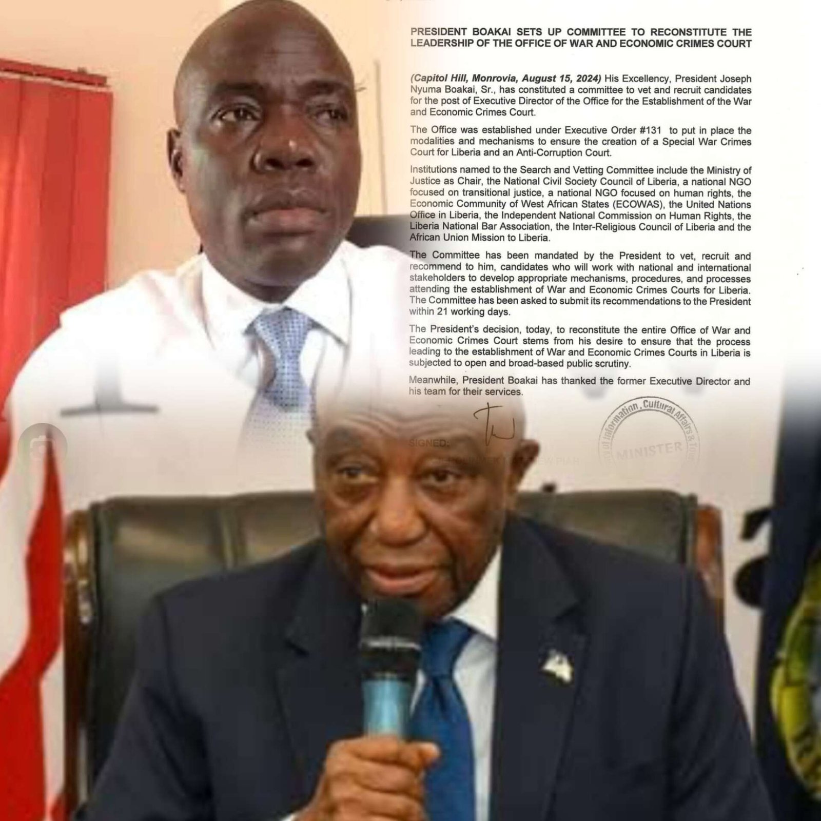 President Joseph Nyuma Boakai has announced the formation of a committee tasked with the reconstitution of the leadership for the Office of the War and Economic Crimes Court.