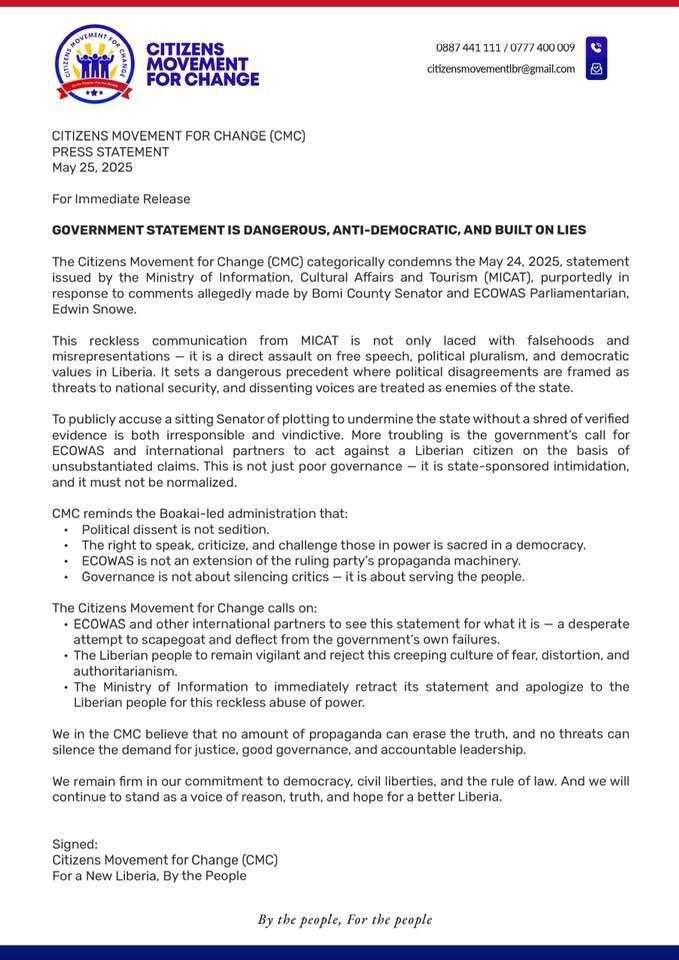 Monrovia, May 25, 2025 The Citizens Movement for Change (CMC) has issued a scathing condemnation of a recent statement by the Ministry of Information, Cultural Affairs, and Tourism (MICAT), describing it as “dangerous, anti-democratic, and built on lies.”
