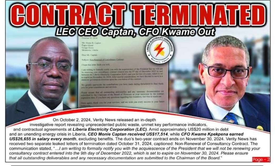 On October 2, 2024, Verity News released an in-depth investigative report revealing unprecedented public waste, unmet key performance indicators, and contractual agreements at Liberia Electricity Corporation (LEC). Amid approximately US$20 million in debt and an unending energy crisis in Liberia, CEO Monie Captan received US$17,514, while COO Kwame Kpekpena earned US$26,655 in salary every month, excluding benefits.