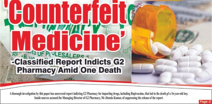 A thorough investigation by this paper has uncovered a classified report implicating G2 Pharmacy in the importation of counterfeit drugs, including a batch of Bupivacaine linked to the death of a 16-year-old boy.