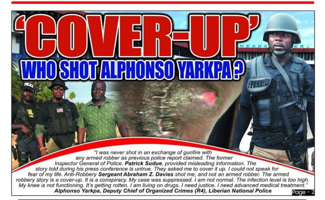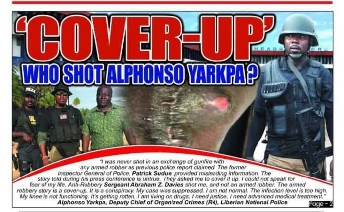 Contrary to what was reported to the media by Police Inspector Patrick Sudue, the investigation of Verity News has uncovered that senior anti-robbery police officer, Alphonso Yarkpa, was never shot by an armed robber during a patrol opposite SWAT (Supplying West Africa Trading Incorporated) Warehouse around Freeport.