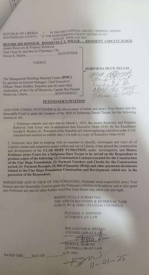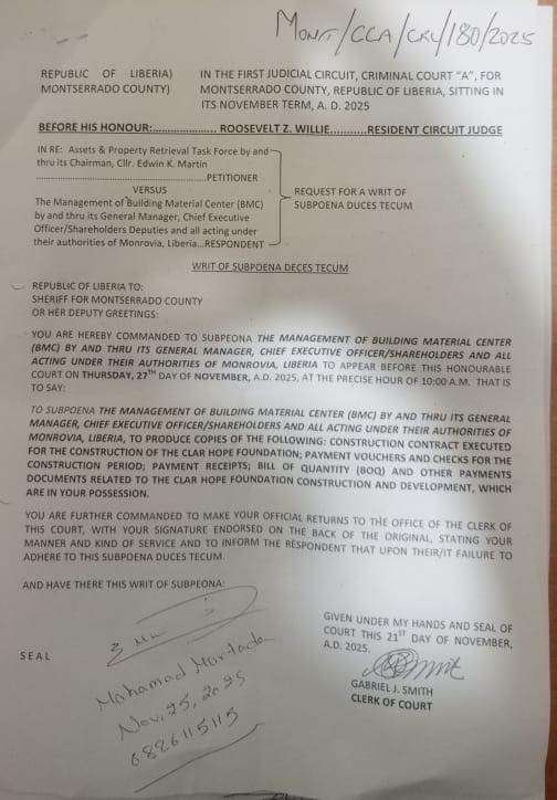 The First Judicial Circuit, Criminal Court ‘A’ for Montserrado County has issued a Writ of Subpoena Duces Tecum ordering the Management of the Building Material Center (BMC) to produce a series of financial and contractual documents linked to the construction of the Clar Hope Foundation.
