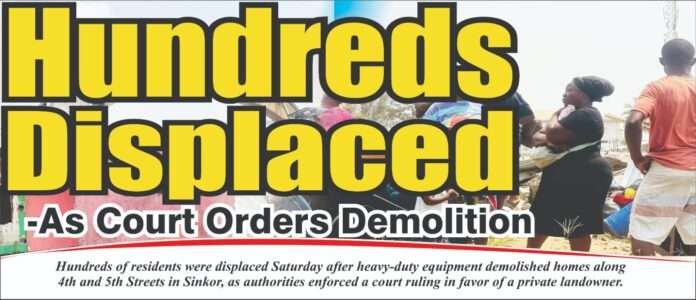 Hundreds of residents were displaced Saturday after heavy-duty equipment demolished homes along 4th and 5th Streets in Sinkor, as authorities enforced a court ruling in favor of a private landowner.