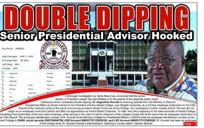 Dr. Augustine Konneh is receiving salaries from the Ministry of State for Presidential Affairs as Senior Advisor to the President and the Harbel College as a full-time employee (instructor) on the CSA Payroll while at the same time serving as Interim Board Chairman.
