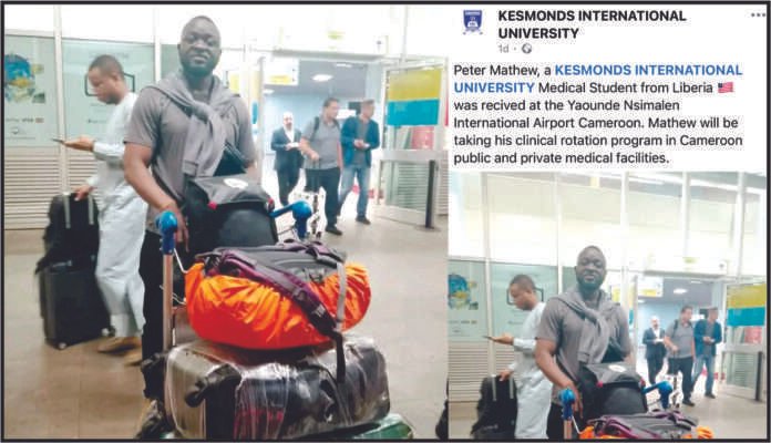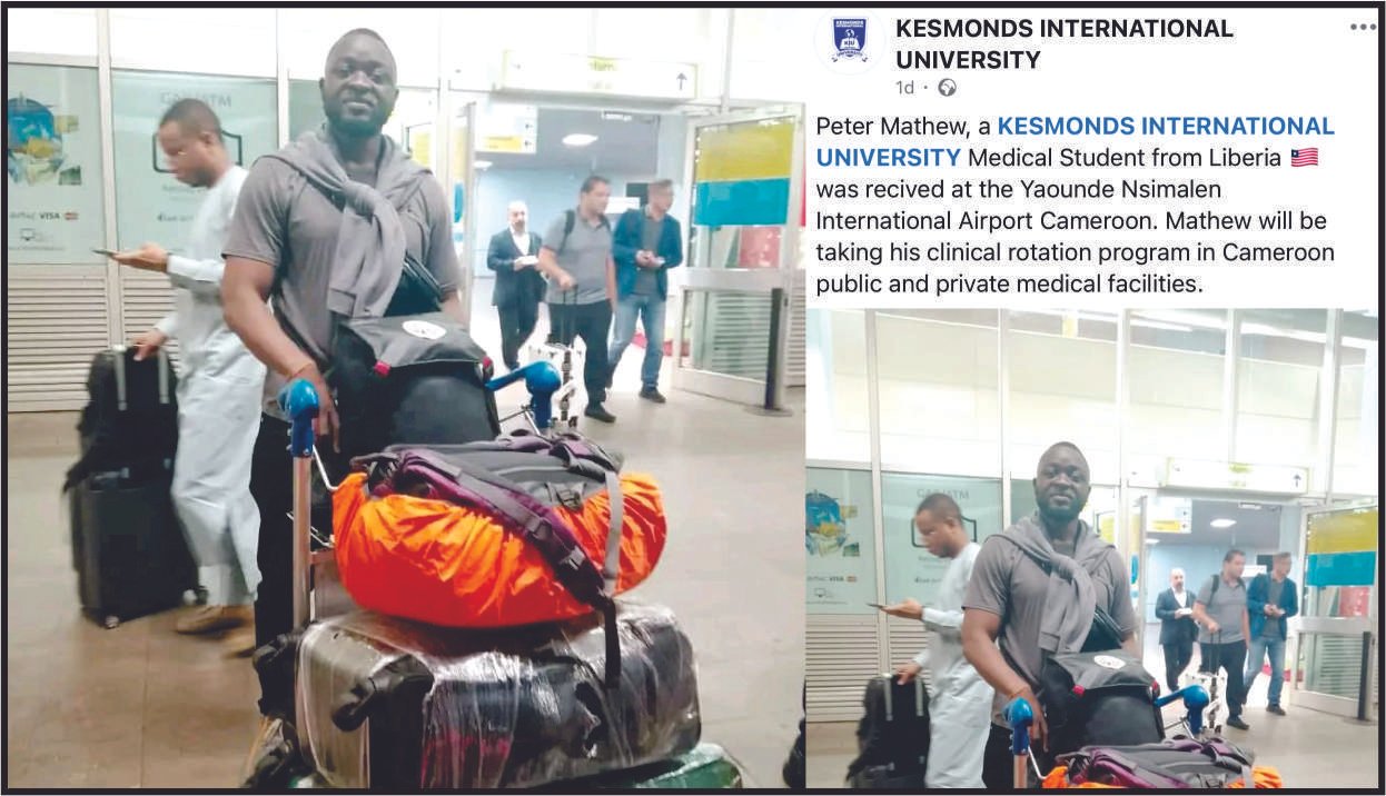 On its official Facebook page, Kesmonds International University announced that George, described as a “medical student from Liberia,” was welcomed at the Yaoundé Nsimalen International Airport, Cameroon. The university claimed that he would be taking part in clinical rotation programs across public and private medical facilities in the country.
