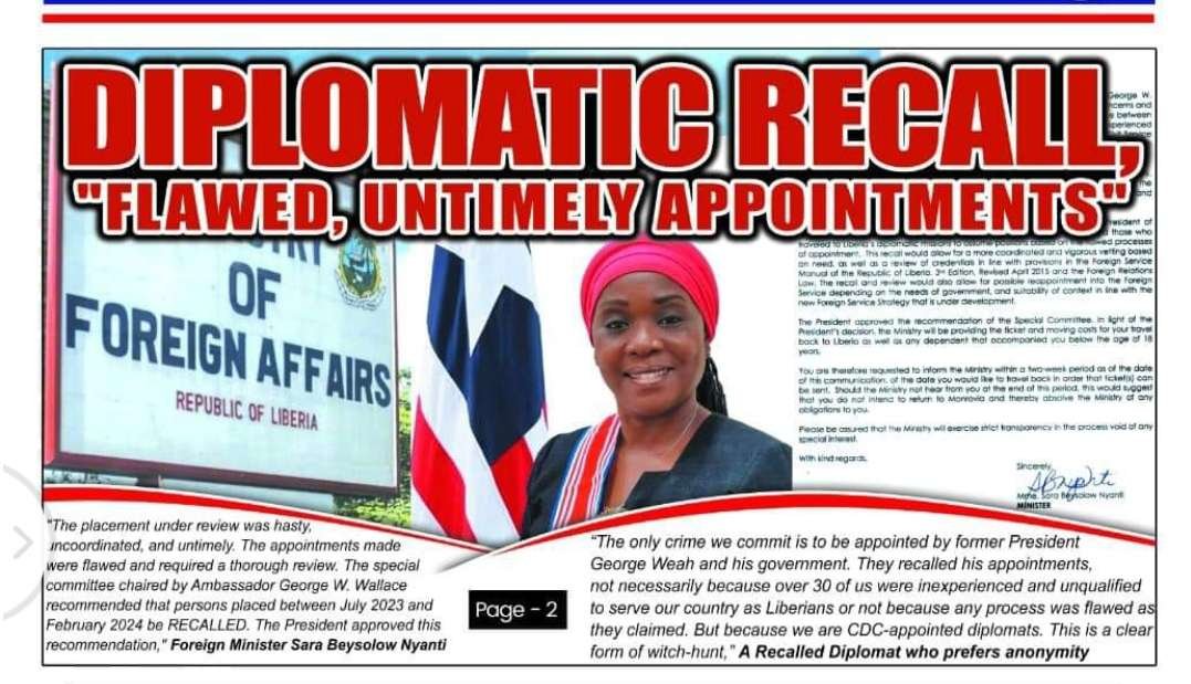 Verity Newspaper has learned that President Joseph Nyuma Boakai has approved the recall of several diplomats appointed to the Liberian Foreign Service between July 2023 and February 2024.