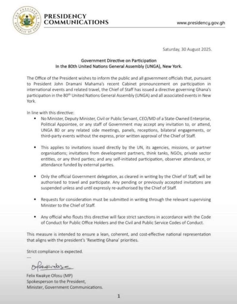 The directive, signed by Minister and Presidential Spokesperson Felix Kwakye Ofosu, comes in the wake of President John Dramani Mahama’s recent Cabinet pronouncement aimed at streamlining international travel by government officials.