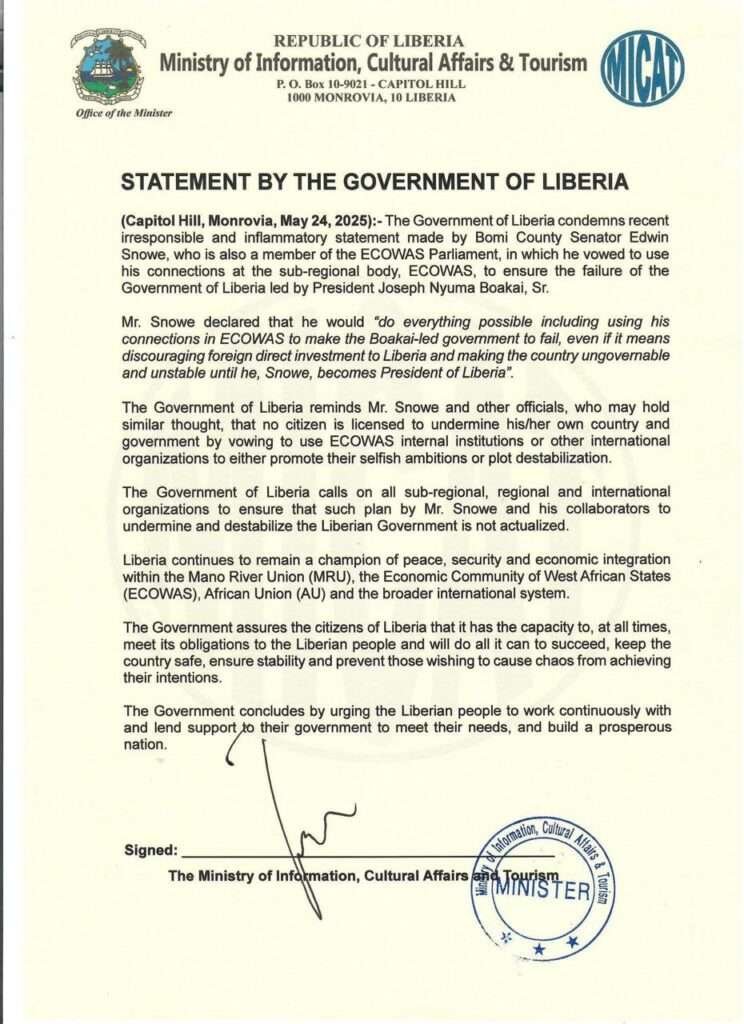 “(𝐂𝐚𝐩𝐢𝐭𝐨𝐥 𝐇𝐢𝐥𝐥, 𝐌𝐨𝐧𝐫𝐨𝐯𝐢𝐚, 𝐌𝐚𝐲 𝟐𝟒, 𝟐𝟎𝟐𝟓):- The Government of Liberia condemns recent irresponsible and inflammatory statement made by Bomi County Senator Edwin Snowe, who is also a member of the ECOWAS Parliament, in which he vowed to use his connections at the sub-regional body, ECOWAS, to ensure the failure of the Government of Liberia led by President Joseph Nyuma Boakai, Sr.