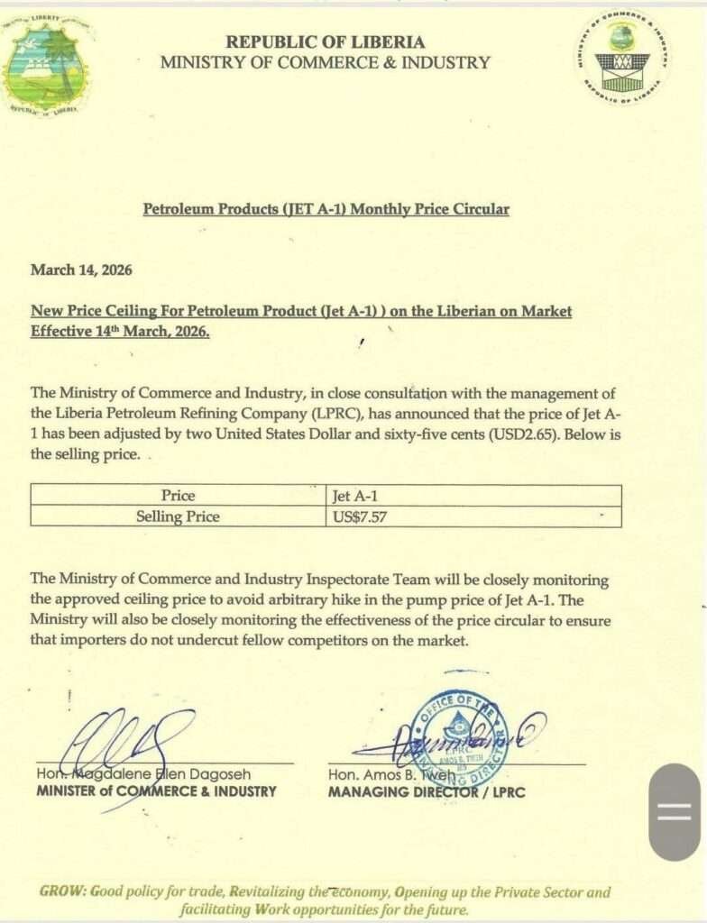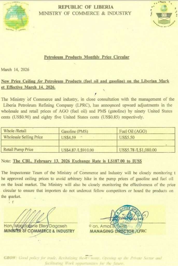 The Liberia Ministry of Commerce and Industry, in consultation with the Liberia Petroleum Refining Company (LPRC), has announced an increase in the ceiling prices for petroleum products on the Liberian market effective March 14, 2026.