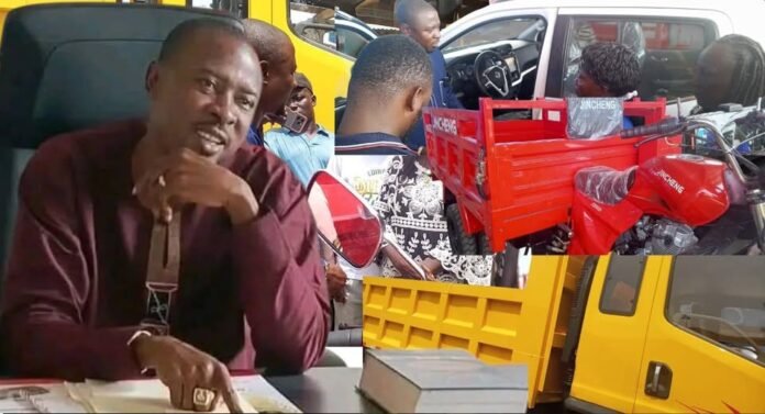 Vehicles received are a mini-dump truck, three tricycles, and two pickup trucks, all geared towards enhancing sanitation, transportation, emergency response, and local administration.