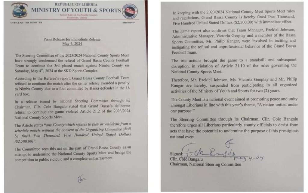 Such behavior from Grand Bassa County has been deemed as an affront to the integrity of the National County Sports Meet, tarnishing its reputation and undermining its fundamental purpose of fostering unity and camaraderie among Liberians.