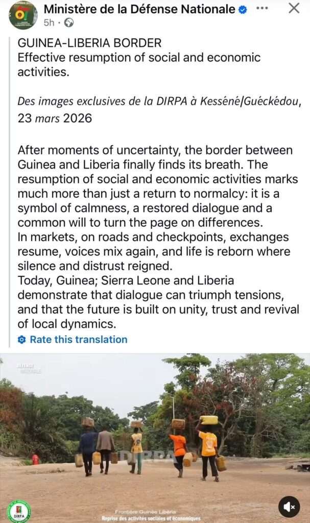 Guinea’s military communication channels say cross-border trade and social activities have resumed in areas such as Kesséné in Guéckédou, signaling calm after recent tensions.