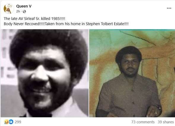 The artist, whose real name is Avenette Tennema Sirleaf, wrote alongside the images: “The late A.V. Sirleaf, Sr. killed 1985. Body never recovered! Taken from his home in Stephen Tolbert Estate.”