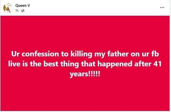 Responding to the remark, Queen V wrote online: “Ur confession to killing my father on ur Facebook Live is the best thing that happened after 41 years.”
