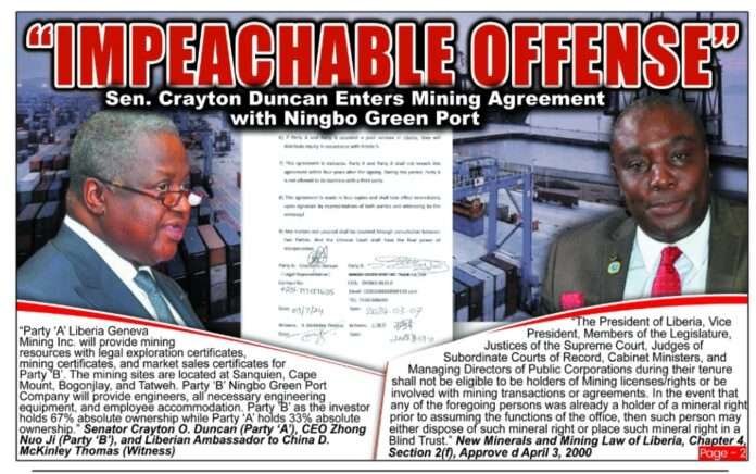 Speaking with Verity News, some legal and political analysts believe that Senator Duncan’s illegal and transactional mining pursuit, which allegedly violates the 2000 Mining Law of Liberia and the 2010 Amended Investment Law, is not just grave but warrants impeachment.