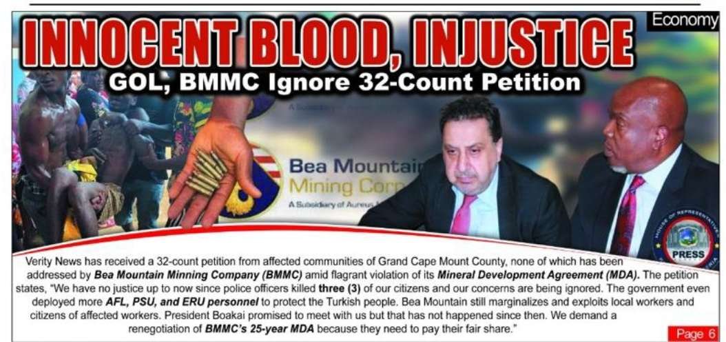 Verity News has received a 32-count petition from affected communities of Grand Cape Mount County, none of which has been addressed by Bea Mountain Mining Company (BMMC) amid flagrant violation of its Mineral Development Agreement (MDA).