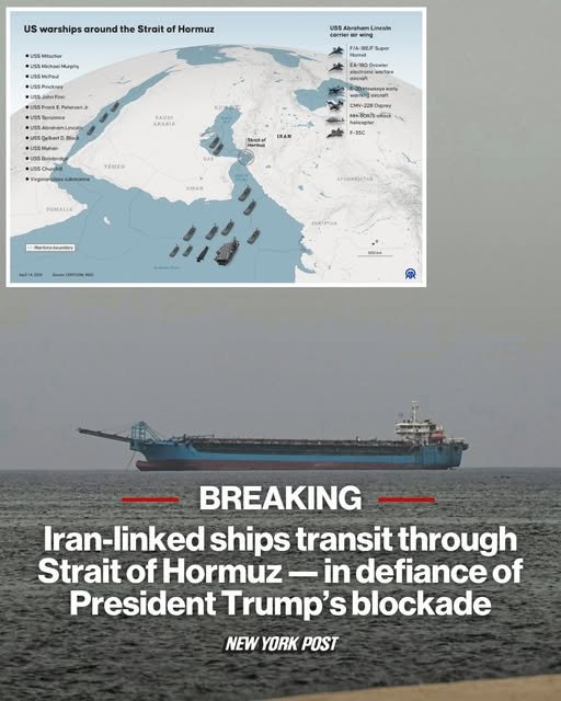 At least four Iran-linked ships – including two that visited Iranian ports – crossed the Strait of Hormuz on Tuesday following the start of a blockade by the US. At least three others also crossed the key shipping channel.