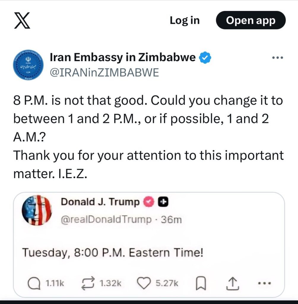 The development comes after Trump reportedly issued an 8:00 p.m. Tuesday deadline for Iran to reopen the strategic Strait of Hormuz, a key global oil transit route. In response, the embassy shared his statement and posted a message that appeared sarcastic in tone.