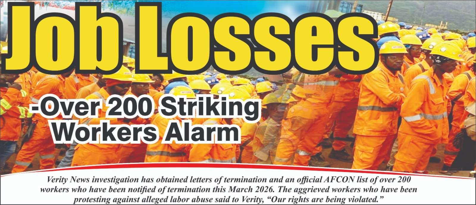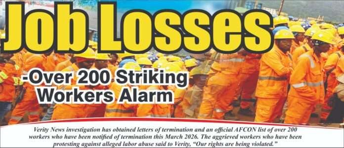Verity News investigation has obtained letters of termination and an official AFCON list of over 200 workers who have been notified of termination this March 2026. The aggrieved workers who have been protesting against alleged labor abuse said to Verity, “Our rights are being violated.”