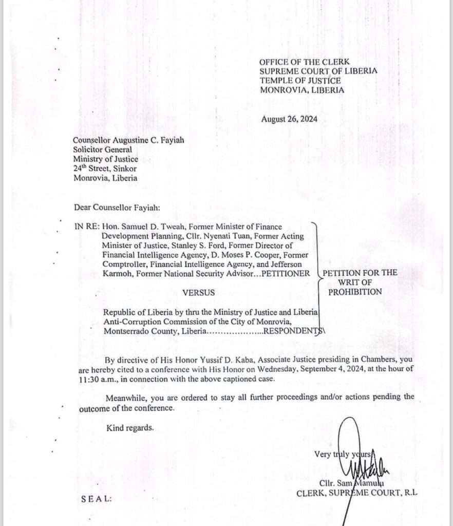 The Justice in Chambers decided on August 24, 2024, leading to the citation of Solicitor General Augustine Fayiah through the office of the Clerk of the Supreme Court, Cllr. Sam Mamuu.