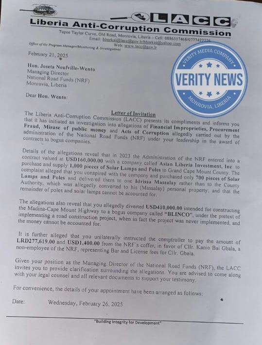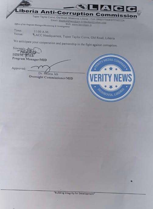 In a letter dated February 21, 2025, the LACC formally invited Madam Wento to clarify the allegations. The letter, signed by Baba M. Boakai, Program Manager of the Monitoring and Investigation Division (MID), and approved by Dr. Matta Jeh, Oversight Commissioner, outlines serious accusations involving questionable contracts and the diversion of public funds.