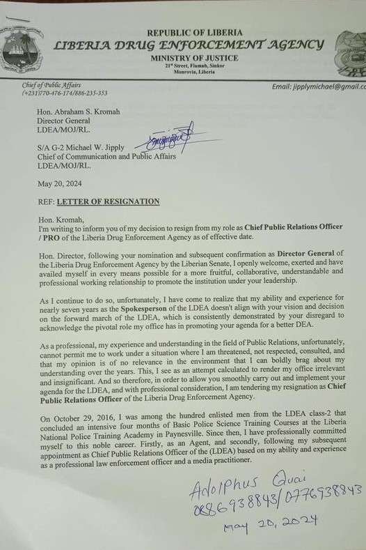 Quai, in his letter of resignation addressed to Hon. Kromah, explicitly cites a misalignment between his experience and vision and the direction set forth by the agency’s leadership. Despite his nearly seven years of dedicated service as the spokesperson for the LDEA, Quai expresses frustration over what he perceives as a lack of recognition for the pivotal role his office plays in promoting the agency’s agenda.