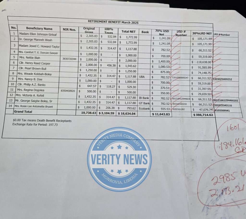 The leaked March 2025 Payment documents also captured US$2,305.83 each as original gross benefits for for Presidents Ellen Johnson-Sirleaf and George M. Weah.