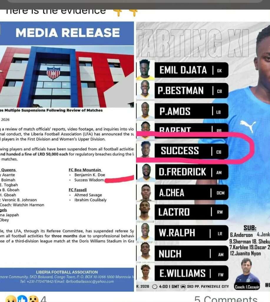 According to chapter three, article 8.4 of the 2025/2026 rules, James should have missed the next league game but he played in the 1-1 draw against Borough FC at D. Tweh field on 21 March.