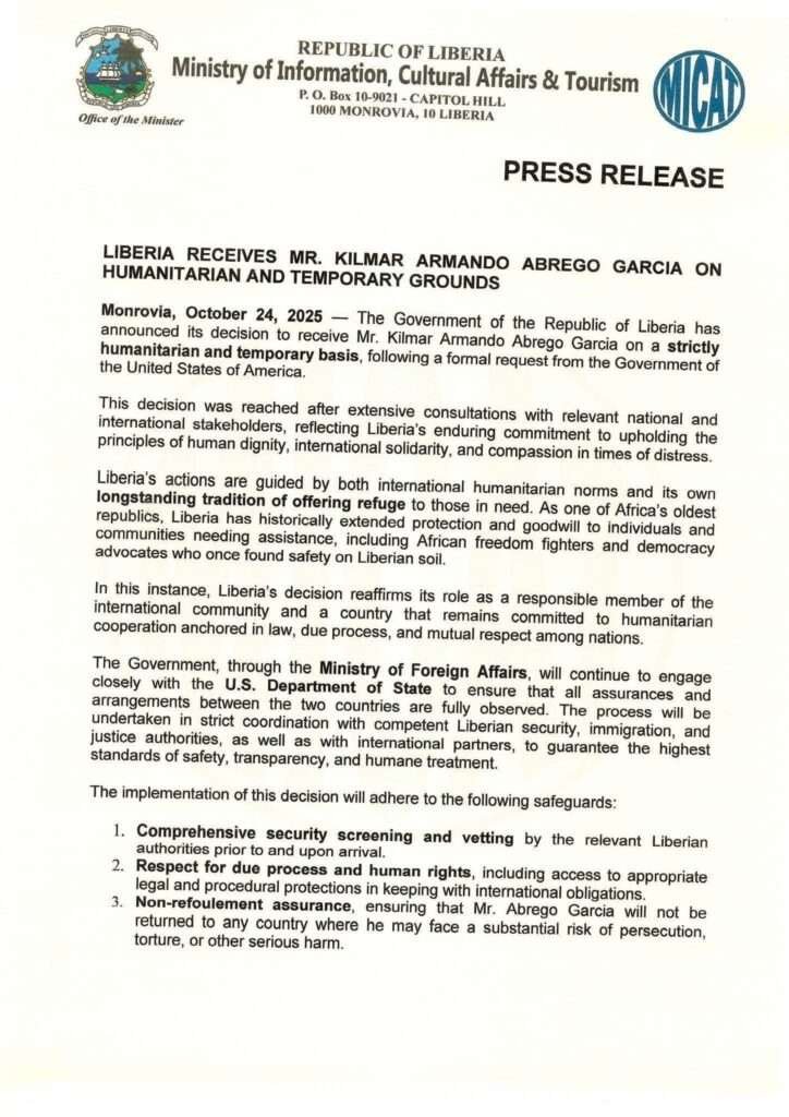 The Government of Liberia has agreed to temporarily host Mr. Kilmar Armando Abrego Garcia on humanitarian grounds, following a formal request from the United States Government.