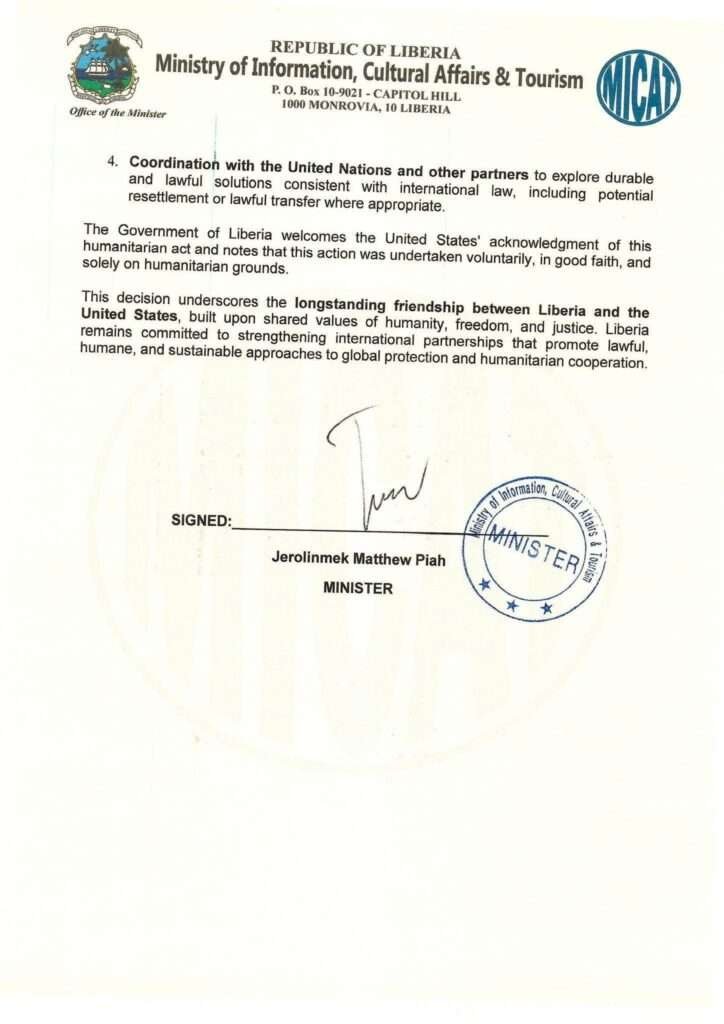 The government of Liberia emphasized that the decision was made voluntarily and in good faith, reaffirming the “longstanding friendship” between Monrovia and Washington; a relationship built on shared values of freedom, justice, and humanitarian cooperation.