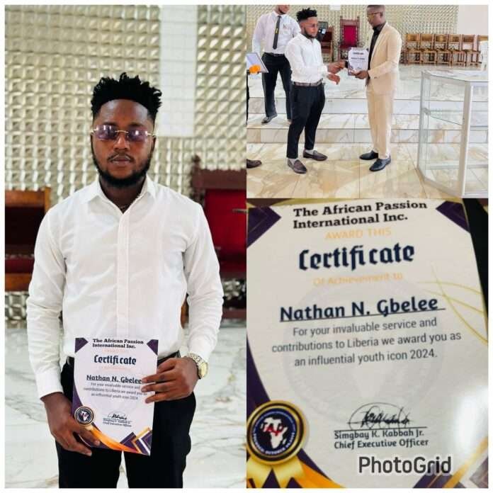 Nathan N. Gbelee, a prominent national youth leader and advocate for educational development, has been honored with the 2024 Influential Youth Icon Award for his extraordinary contributions to education and youth empowerment in Liberia. The award ceremony, organized by The African Passion International Inc., took place in Monrovia and was attended by over 150 participants, including distinguished guests and other honorees.