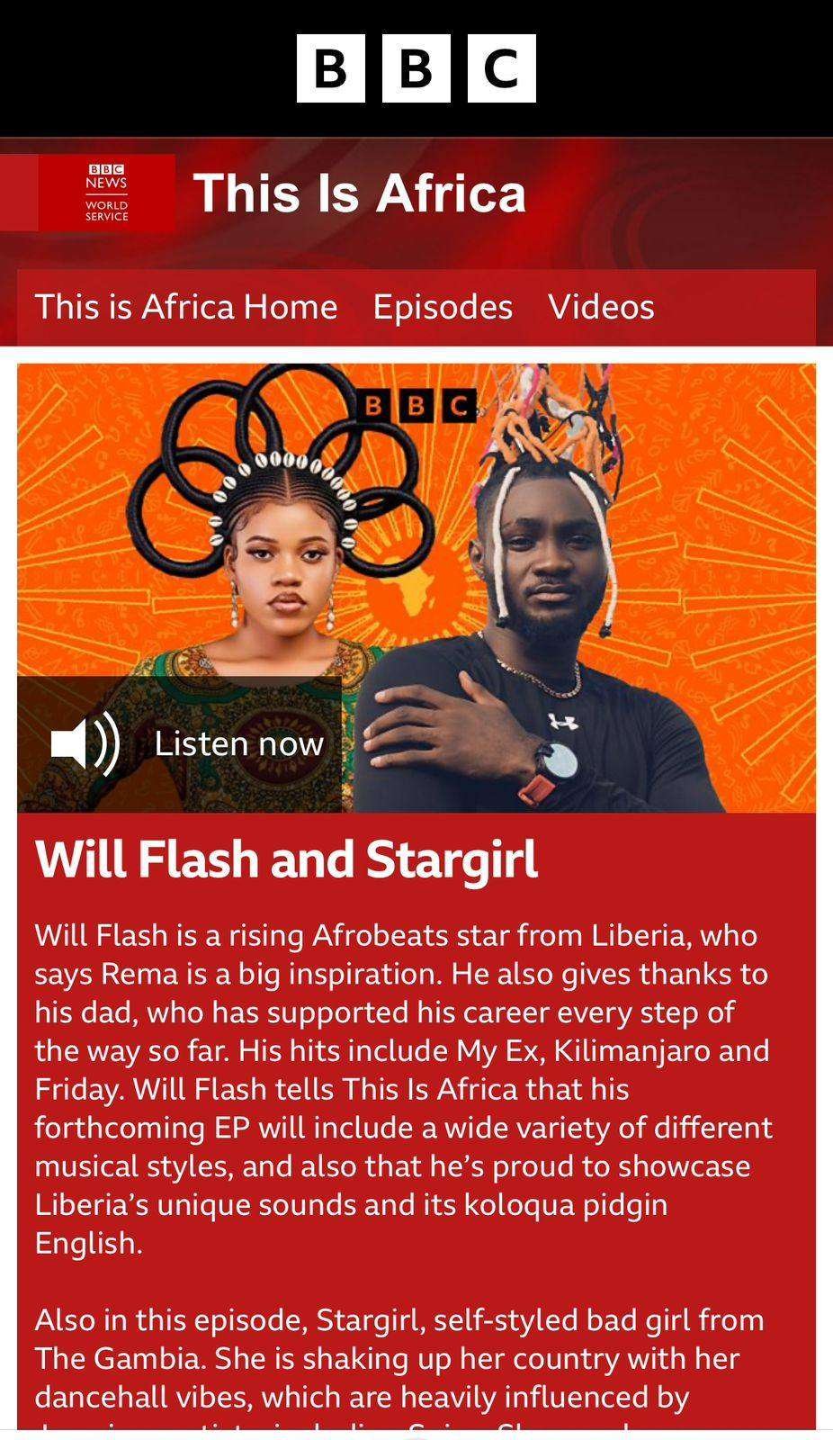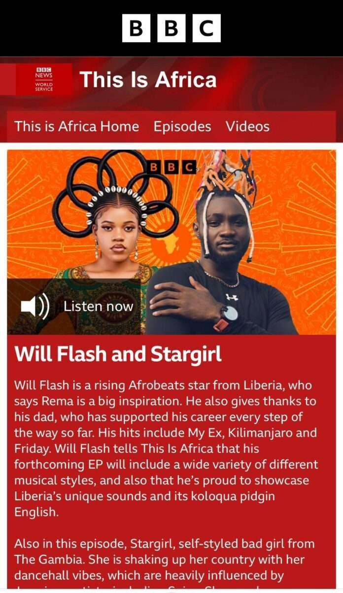 The SOG Records Empire hitmaker said he was proud to showcase what Liberia is made of; its unique sounds, styles, and colloquia culture (pidgin English). The British Broadcasting Corporation (BBC) featured Wil Flash alongside with The Gambian-based musician Stargirl.