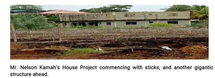 In a subtle way of blaming the Environmental Protection Agency (EPA), when asked about the environmental implications of building a house on the wetlands, Nelson Kamah asserted that since the construction process began, no one from the EPA has told him to halt the project. He also mentioned that there are other gigantic structures standing in the same swamp just a stone’s throw from his project (as seen in the photo above). A tour of the community revealed how residents are carrying out massive construction works in the swamp without guidance.