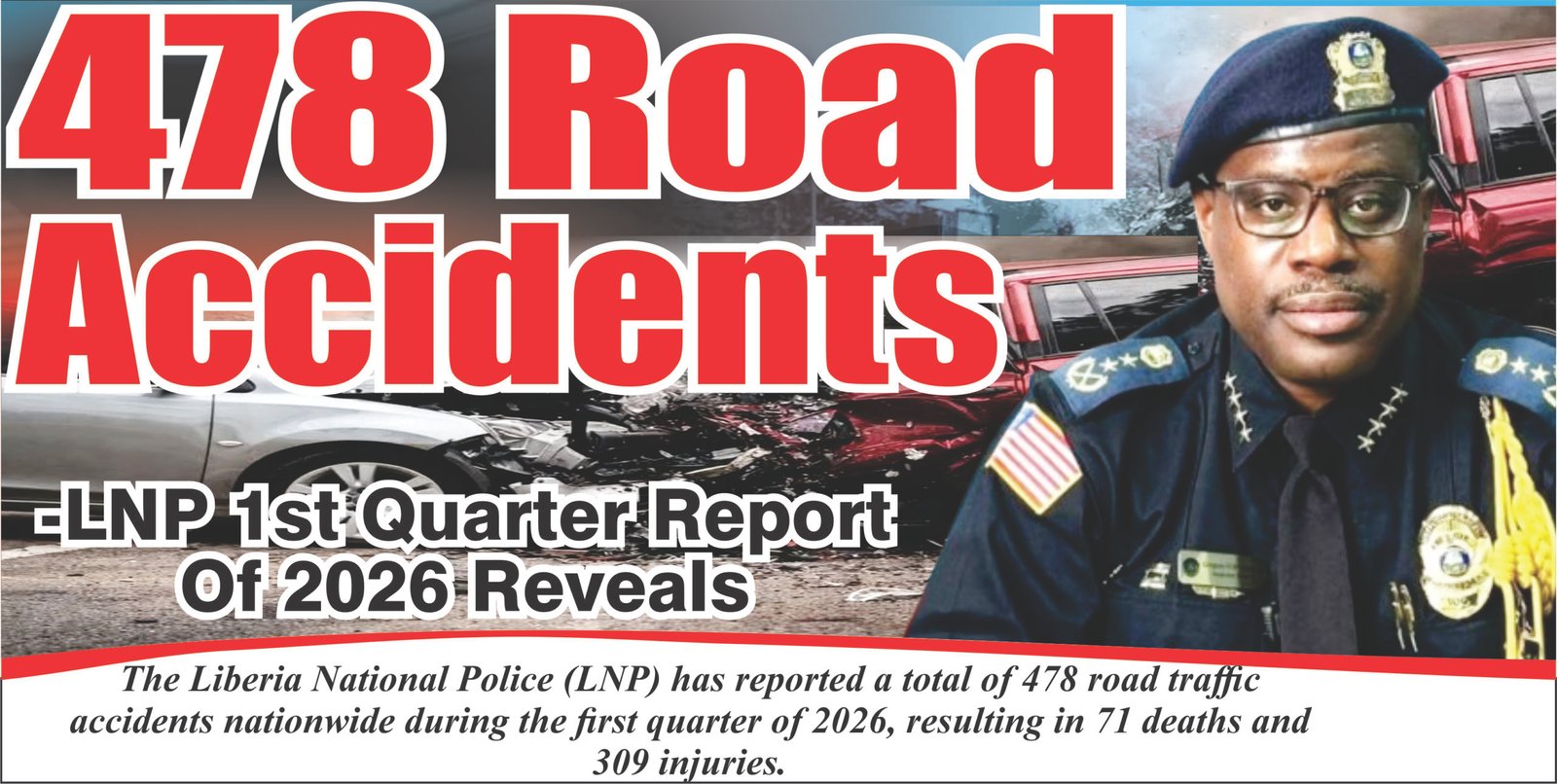 The Liberia National Police (LNP) has reported a total of 478 road traffic accidents nationwide during the first quarter of 2026, resulting in 71 deaths and 309 injuries.
