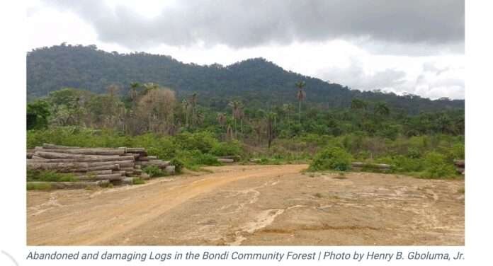 In Bondi Authorized Community Forest in Bopolu District, the remnants of a lodging company’s negligence are starkly visible – massive abandoned logs scattered amidst the trees, a haunting reminder of the industry’s footprint.