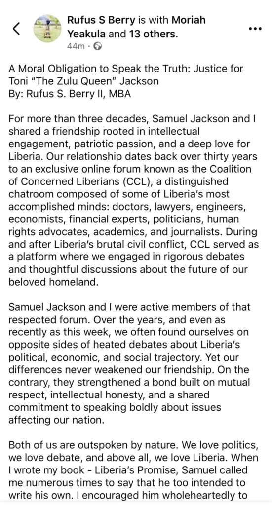 Berry said his friendship with Samuel Jackson spans more than three decades and began through the Coalition of Concerned Liberians, an online forum where Liberian professionals debated national issues during and after the country’s civil conflict.